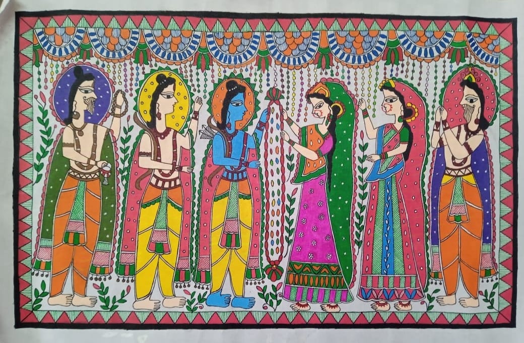 Celebrate tradition with this full-length painting crafted on handmade paper in authentic Madhubani style. Featuring intricate lines, bold motifs, and vibrant natural colors, it beautifully narrates stories from Indian folklore and mythology. Perfect for framing, wall décor, or gifting, this painting is a timeless blend of culture and artistry, made by skilled artisans.