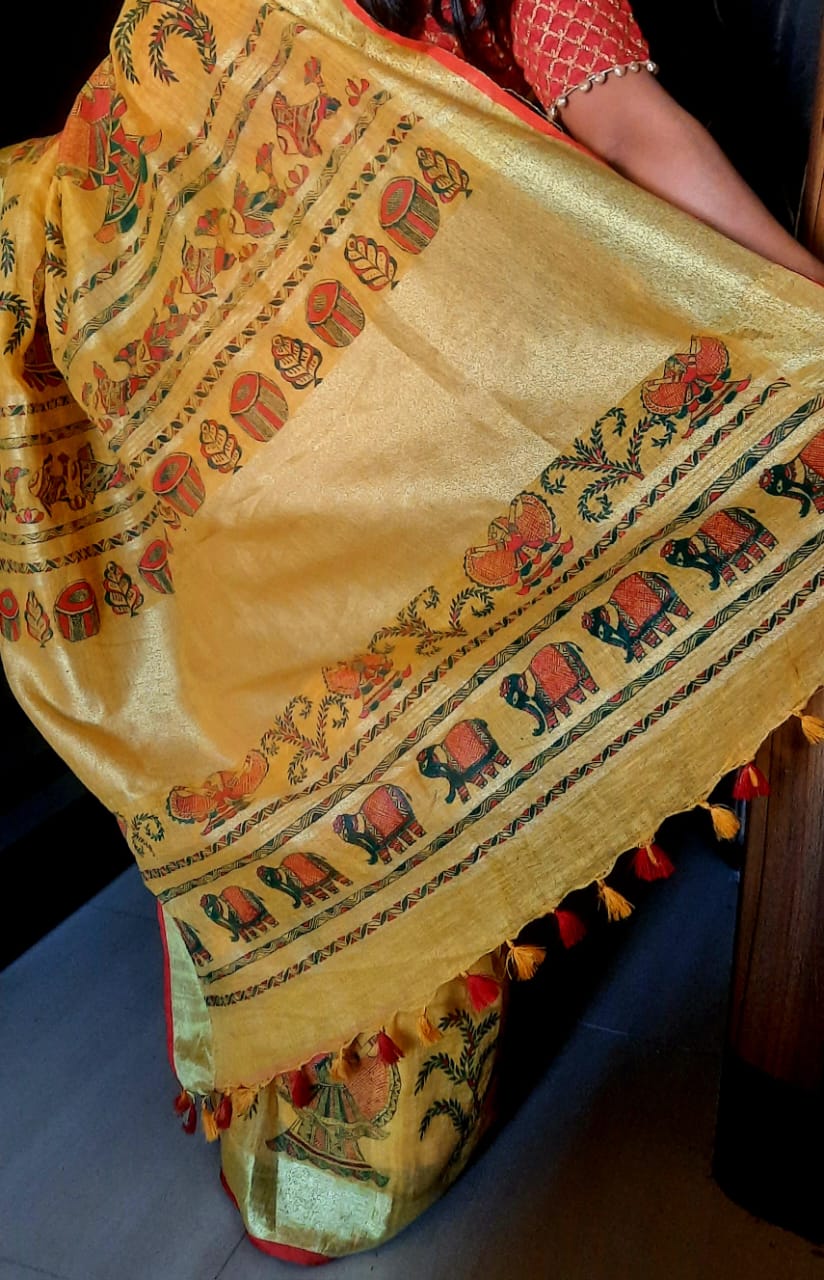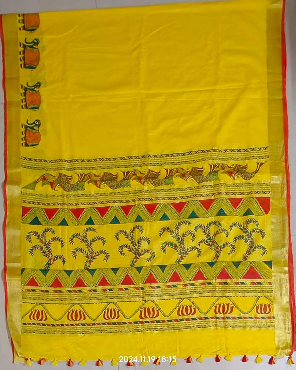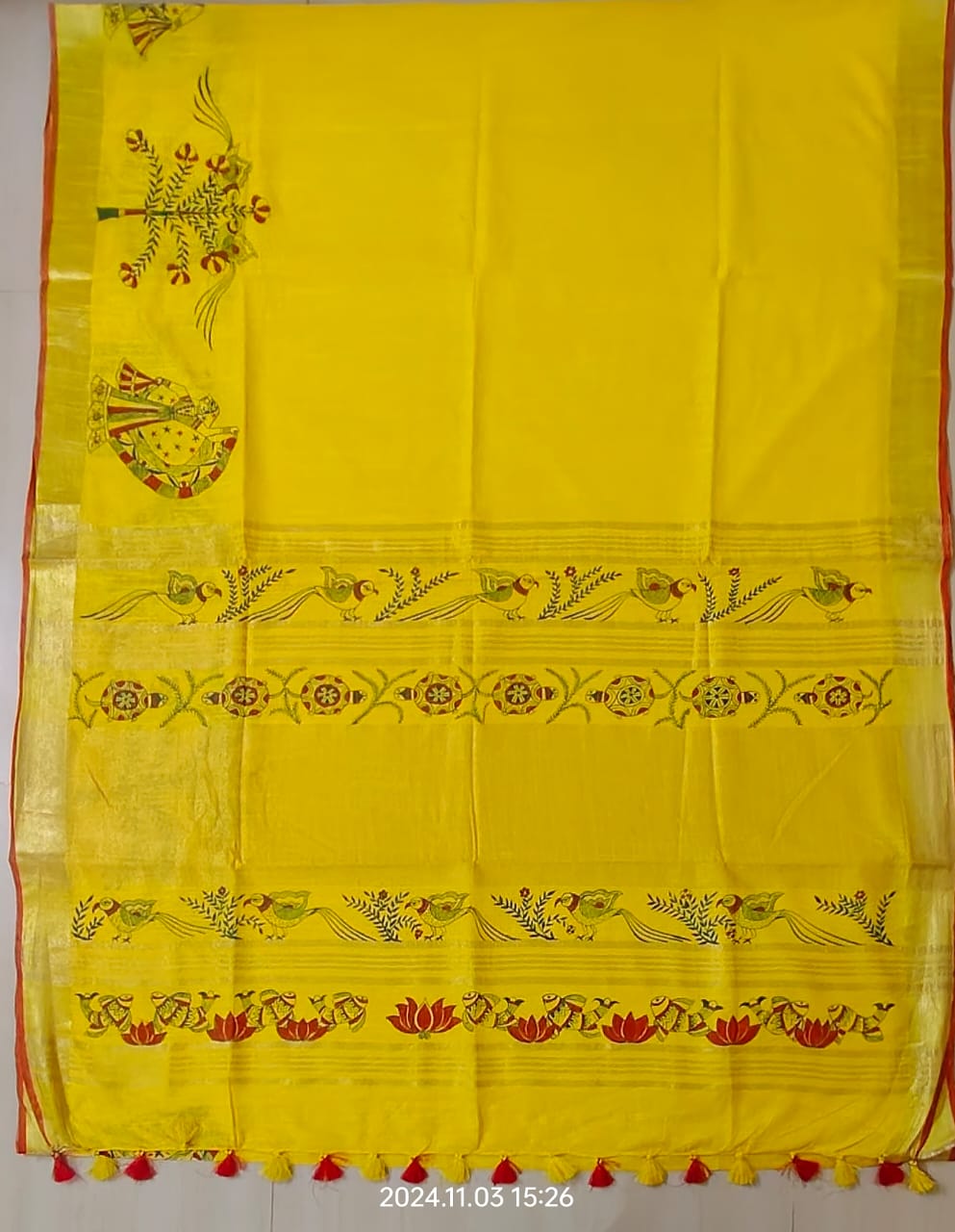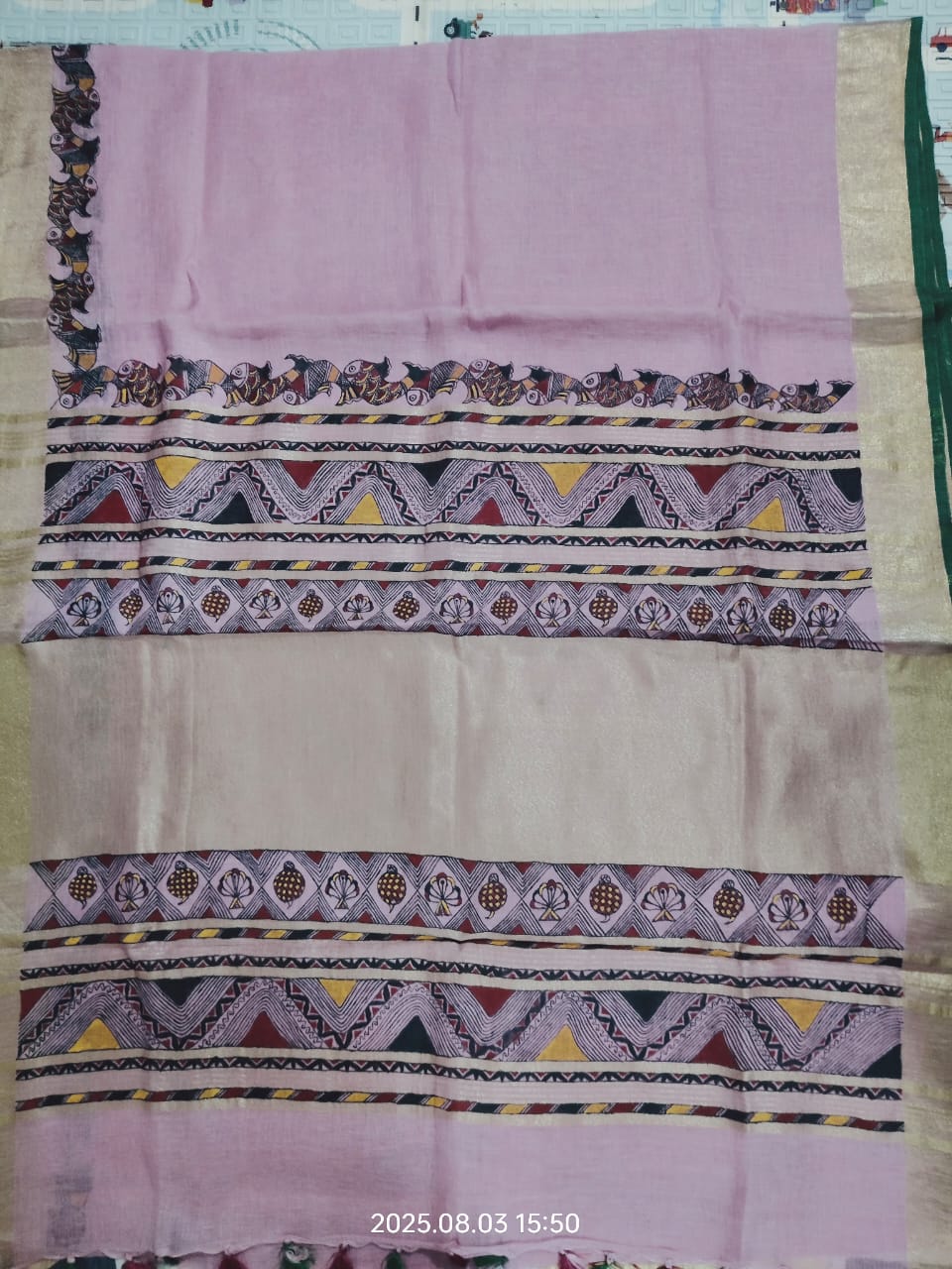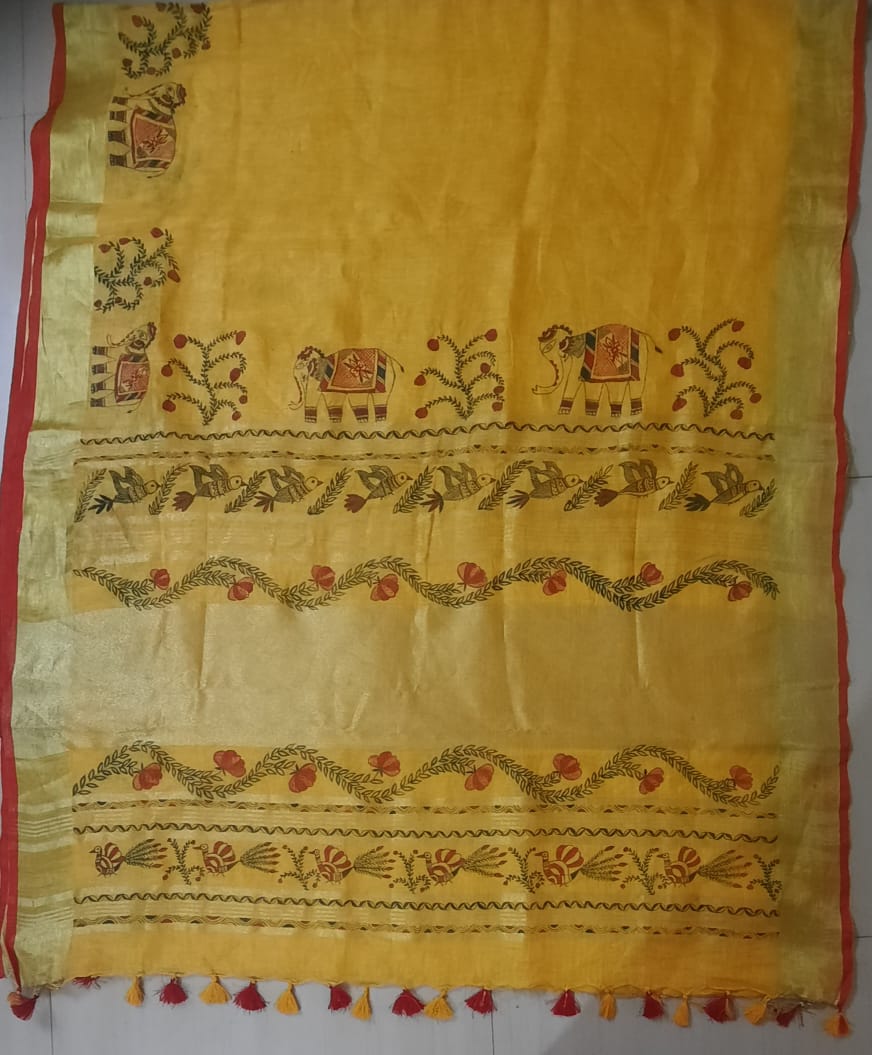 Drape yourself in heritage with this handcrafted linen saree adorned with Manjusha art. Known for its bold lines and vibrant folk motifs, Manjusha art beautifully narrates tales from Bihar’s cultural traditions. The breathable linen fabric adds comfort and sophistication, making it ideal for festive occasions, office wear, or elegant gatherings. A perfect blend of tradition and style, this saree is a true statement piece for every saree lover.
